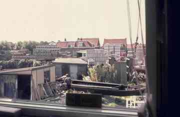 Woonboot De Rijndam met op de achtergrond de ABEX-betonwarenfabriek.