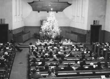 Dominee dr. C. Vermeulen in de zaal van de Hervormde Kerk over zijn proefschrift