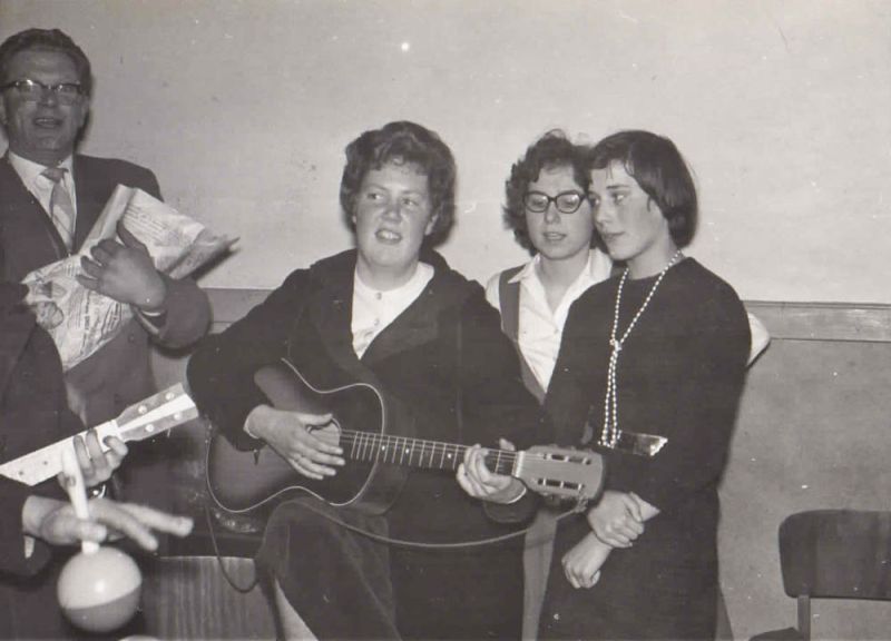 In zaal de Vries, oefenavond Harmonie met o.a. Anneke Glasbergen, later gehuwd m
