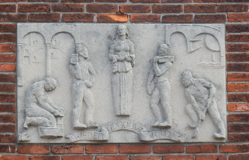 Het 100ste herbouwhuis staande op de hoek van de Burg. Lotsystraat Marinus Pos