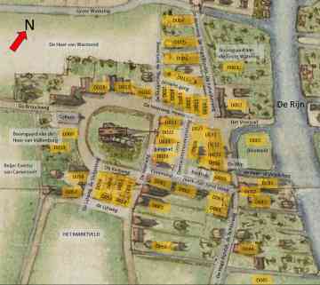 Hier is een deel van de kaart van Bilderbeeck uit 1627. Op deze kaart zijn een heel aantal gele rechthoeken met D-nummers toegevoegd, dit zijn geïdentificeerde huizen of erven waarvan gereconstrueerd kon worden wie daar gewoond heeft (of liever gezegd, eigenaar van was). Daarnaast zijn er ook straatnamen en namen van andere landschapskenmerken (Bleekveld, Wip, Kerkhuis, Tolhuis, boomgaard) toegevoegd. Meer informatie over elk D-nummer (en ook over Wip, Kerkhuis, Tolhuis) is te vinden in de gekoppelde “Vensters”. Daarin staan de opeenvolgende eigenaren/bewoners, en de bron-teksten uit de archieven, die tot deze reconstructie hebben geleid.