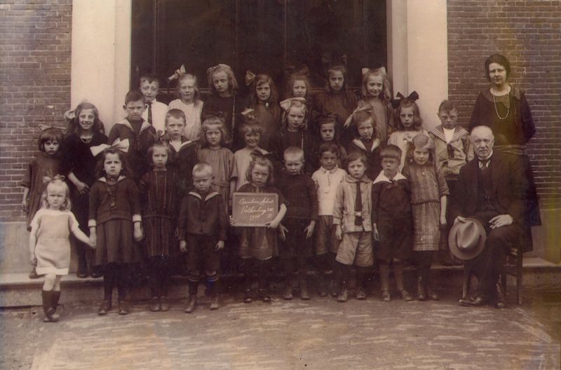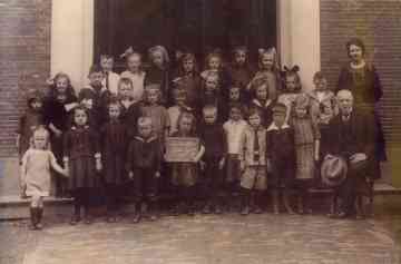 Schoolfoto Openbare School genomen voor de kerkdeur aan het Kerkplein.