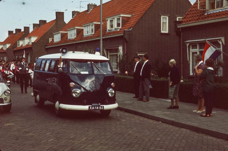 Paardenmarkt. Optocht Burgemeester Lotsystraat met volkswagen politiebus.
