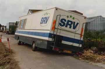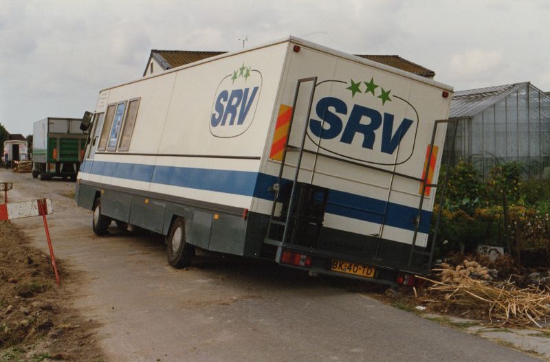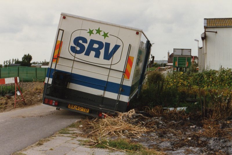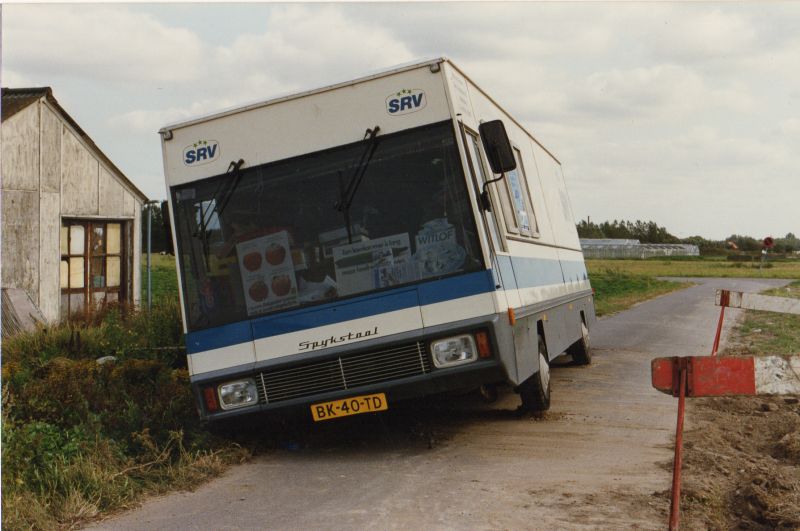 SRV-wagen van Mart van Diemen zakt weg in de berm.